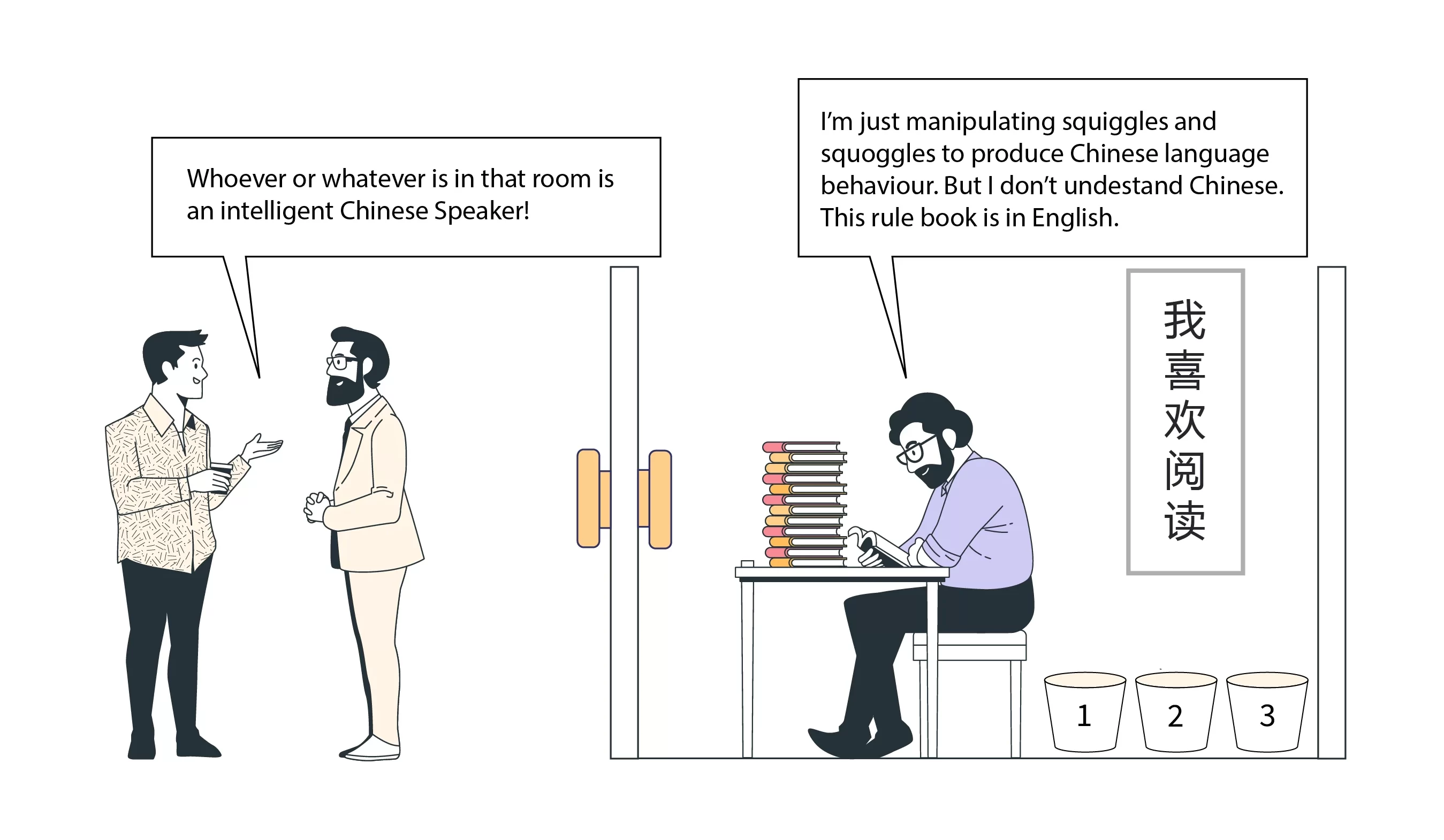 Searle claims that there is no substantial difference between the two cases. Both the computer and the English speaking person are following a program/ instructions which simulate understanding. However, we would not claim that the English speaking person understands Chinese, and therefore, we must conclude that the computer also does not understand Chinese. Searle argues that without understanding, we cannot be described as thinking, and because the computer doesn’t understand, we cannot describe what the machine is doing as thinking. Therefore, Searle concludes that strong Artificial Intelligence is not possible. Searle argues that without understanding, we cannot be described as thinking, and because the computer doesn’t understand, we cannot describe what the machine is doing as thinking. Therefore, Searle concludes that strong Artificial Intelligence is not possible.