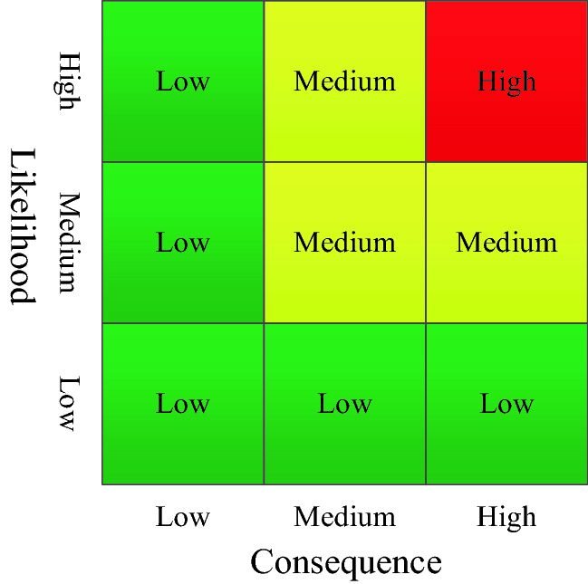 A risk matrix is defined as a table that is divided into several categories of probability, likelihood, or frequency for its rows, and multiple categories of severity, impact, or consequences for its columns. The constituents of risk ordinarily attest themselves as a hazard; which refers to the likely origin of a harmful outcome and harms; which are the ensuing damages to the environment. It incorporates generally accepted ratings of risk, urgency and priority, with every row-column pair. This is represented by distinct cells which are separately colored, using red, green and yellow colors. Each distinct cell has a different risk rating, for instance, cells colored in red will indicate risks that require an urgent attention, whereas those that are colored in green will indicate those risks that do not require to be dealt with urgently. The yellow colored cells indicate those risks that fall in between the ratings of very urgent and less urgent risk events. The qualitative rankings provided by risk analysis matrices, reflect a rudimental quantitative grading.
