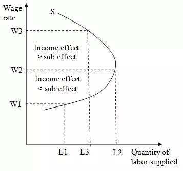 The backward bend in the supply curve results from the increase of wage rate beyond W2. Beyond W2 the individuals earns enough income to sustain their lifestyle, thus do not need to work for extra hours. Hence individuals prefer to increase leisure time and reduce the hours spent at work.