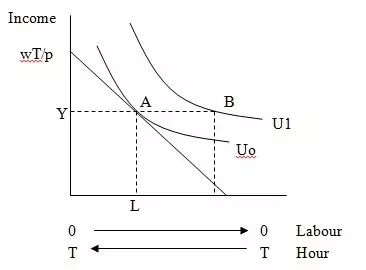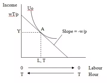 From the above graph, the intercept of the budget constraint on the Y (income) axis is wT/p; giving the full income point. The budget constraint has a slope of –w/p. hence the downward slope. At the point of tangency (point A) between the indifference curve and the budget constraint, giving certain optimal levels of Y and L or Y and T, maximizes the utility.