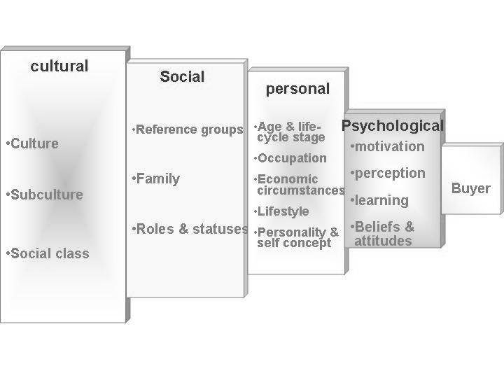 Cultural factors exert the broadest and deepest influence on consumer behavior. The roles played by the buyers culture, sub culture and social class are particularly important.