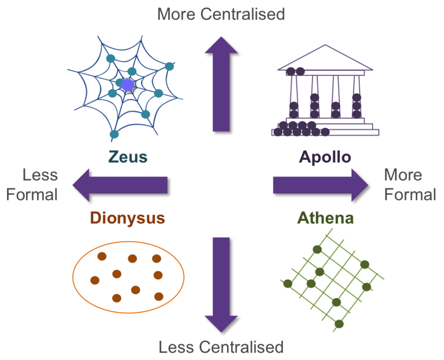 The power culture relies on single central source of power in the organization. It will lead to low morale and high turnover on the positions of middle management. The power culture is like web which has different strings attached to the central point for the facilitation and co ordination of any action. The power is distributed from one single power source in the middle. Handy give linked this terminology with the culture of the ”Zeus”. He was the leader of the gods of mountains.