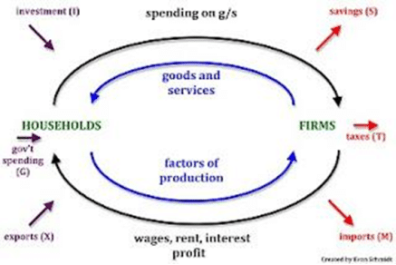 The circular flow model is used to represent the monetary transactions in an economy. It helps to show connections between different sectors of an economy. It shows flows of goods and services and factors of production between firms and households. The circular flow of income is a model that helps show the movement of income and spending throughout the economy. In the economy, households help provide firms with factors of production, e.g. labour. Organisations use these factors to provide goods and services to the household. The households will then spend their money on the goods and services provided by the firms. This money is use by the firms to pay the households for the work they provide, through wages. This process will repeat itself and then form the circular flow of income.